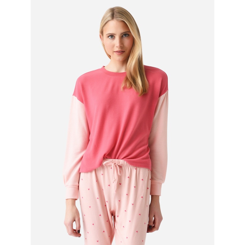DESCRIPTION:Cozy brushed knit top with color block details.FEATURES:TopCrew NecklineDropped ShoulderContrast Long SleeveStraight HemBanded Cuffs and HemBrushed Knit Fabrication62% Polyester, 33% Rayon, 5% SpandexRelaxed FitModel is wearing size Small top.M