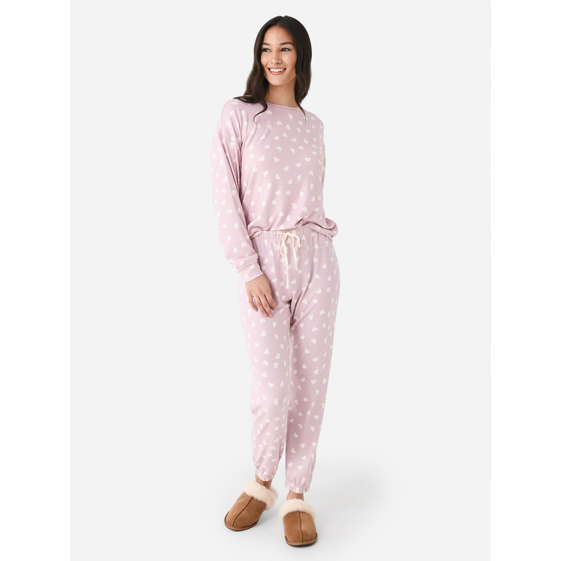 A lounge-able set that includes a crewneck pullover and jogger featuring a cute all-over heart print.